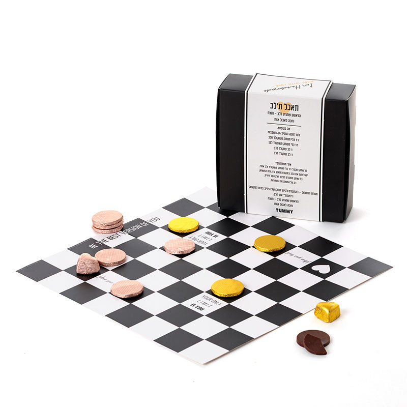 לוח שוקולדים בעיצוב דמקה, שילוב מושלם של משחק, יצירתיות וטעם. הלוח כולל 64 משבצות מעוצבות בקפידה, לצד 11 מטבעות שוקולד חלב ו-11 מטבעות שוקולד לבן, המאפשרים חוויית משחק מתוקה במיוחד. להשלמת החוויה מצורפות קוביית שוקולד לבן וקוביית שוקולד חלב, ליצירת מראה ייחודי ומעורר עניין. זהו מוצר פרסומי מקורי ומרשים.