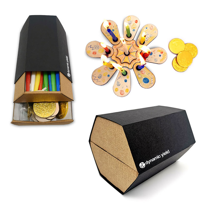 - הקופסה כוללת: 44 נרות, חנוכיית עץ לצביעה והרכבה לצורת פרח