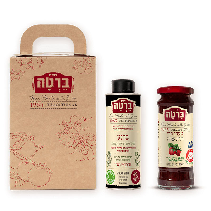מארז שי יוקרתי לחגים שכולל שמן זית פחית מהודרת 200 מ"ל ומעדן 100% פרי תות שדה 284 גרם.