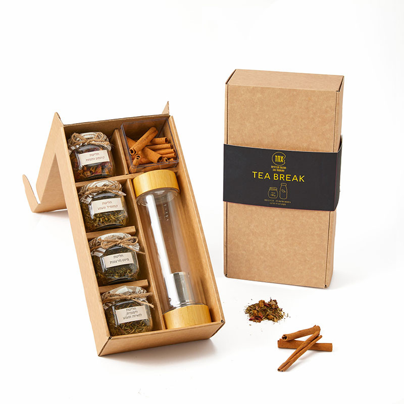 המארז כולל בקבוק איכותי לחליטות לצד מגוון צנצנות עם תערובות תה מובחרות: לימונית, לואיזה ונענע; קמומיל ונענע; קינמון ותפוח; ומינט מרעננת – כל אחת במשקל 30 גרם. בנוסף, מקלות קינמון טבעיים (60 גרם) להעצמת הטעם והארומה. זהו מארז פרימיום מושלם כמתנה לעובדים, לקוחות ואירועים.