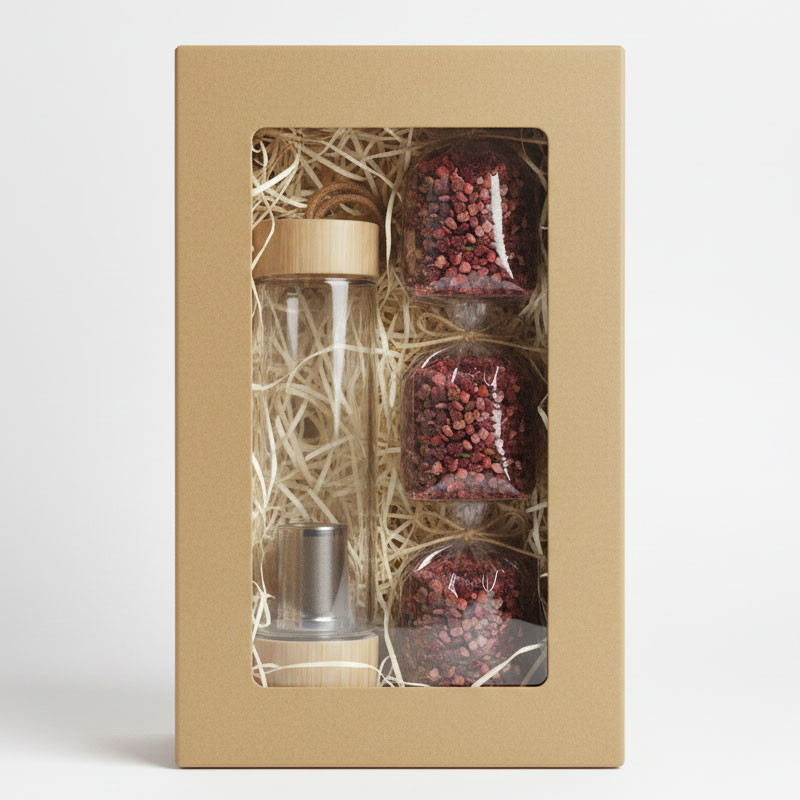 מארז חליטת סיידר ובקבוק חליטה – מתנת שי, טבעית ושימושית לכל חג ולכל עובד. המארז מגיע באריזת קרטון אלגנטית עם חלונית, וכולל חליטת פירות בטעמי פירות יער, ארוזה בשקית צלופן איכותית במשקל 100 גרם. לצידה מצורף בקבוק חליטת תה מעוצב עשוי במבוק בנפח 400 מ״ל, לשימוש יומיומי נוח ובריא. ניתן למתג את הבקבוק בלוגו החברה וליצור מתנה אישית עם נוכחות ערכית וממותגת. פתרון מושלם למארזי עובדים, לקוחות וקד״מ.