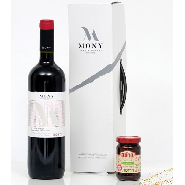מחפשים מארז יין קלאסי לחג? מה בדבר יין אדום קברנה סוביניון איכותי מבית יקב מוני, בתוספת צנצנת של חרוסת במארז קשיח מהודר?